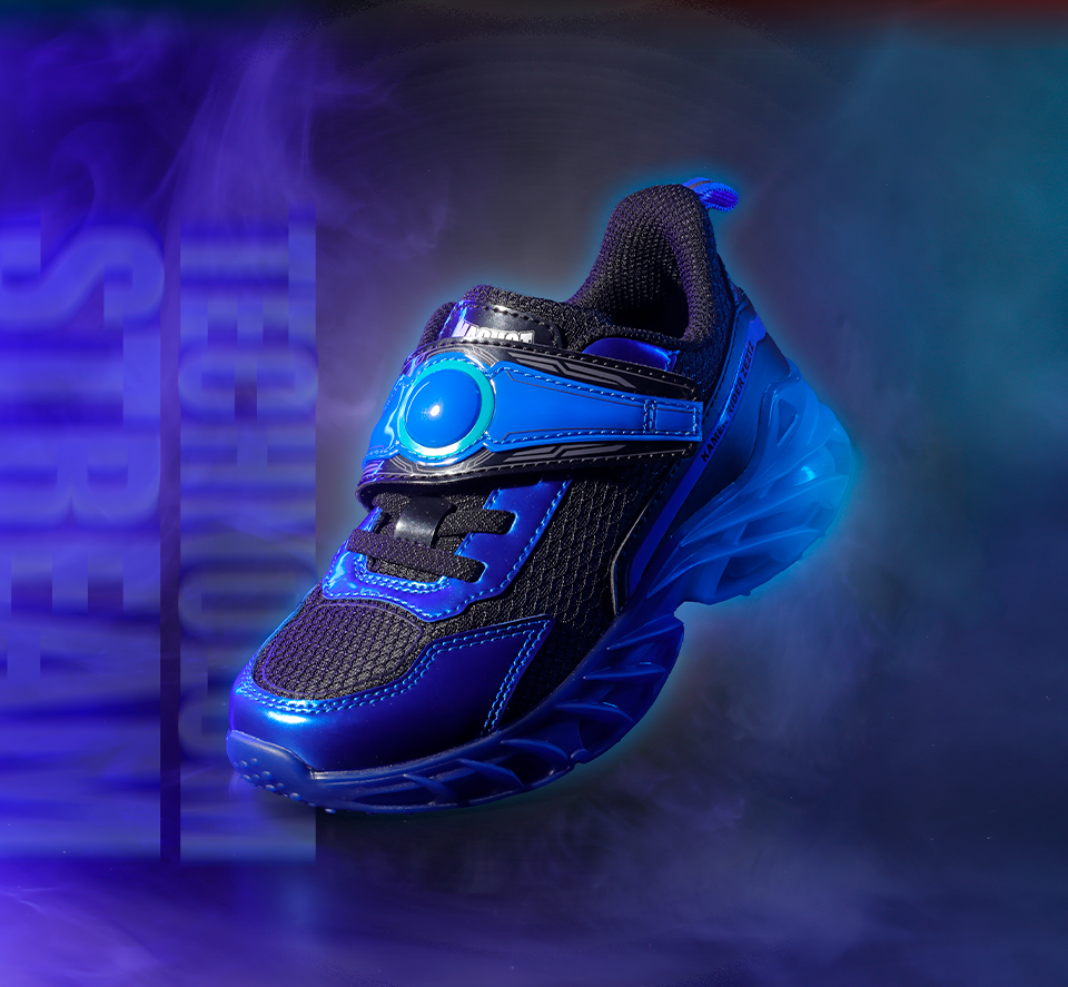 “ 胸に巻く変身ベルト ”「 ゼッツドライバー 」 をモチーフに、シューズベルトをななめに取り付けた 本商品 は、歩くたびに振動によってベルト部分が光る 仕掛けが施されています 。